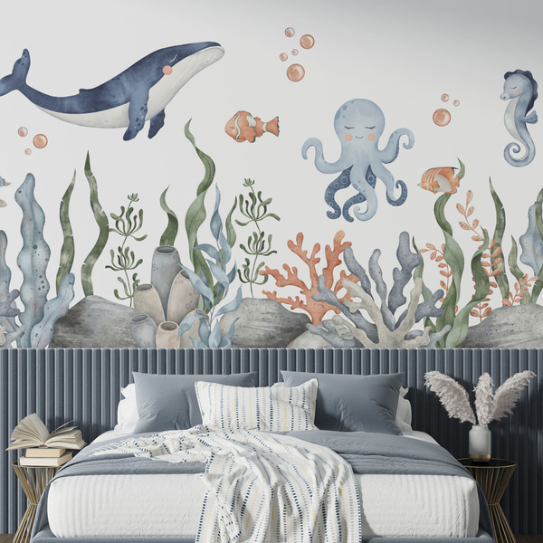 Текстурирани симетрични дизајн мандале који прекрива пејзаж са морем, брдима и небом, меке пастелне боје