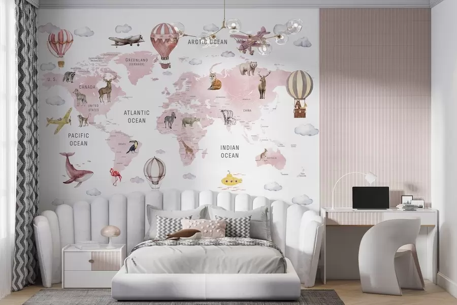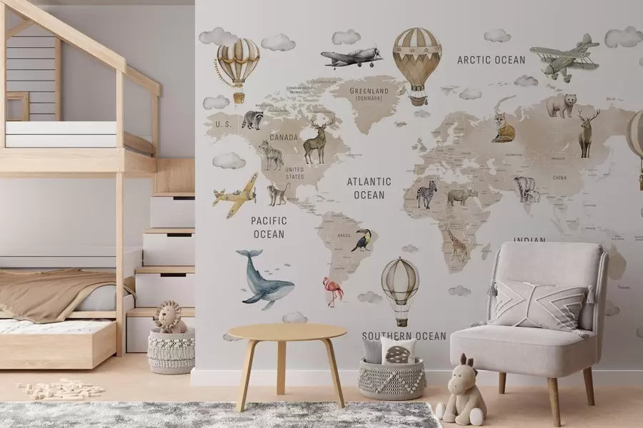 Дизајн тапета за дечију собу са жирафом, ракуном, зецем и пандама на љуљашци