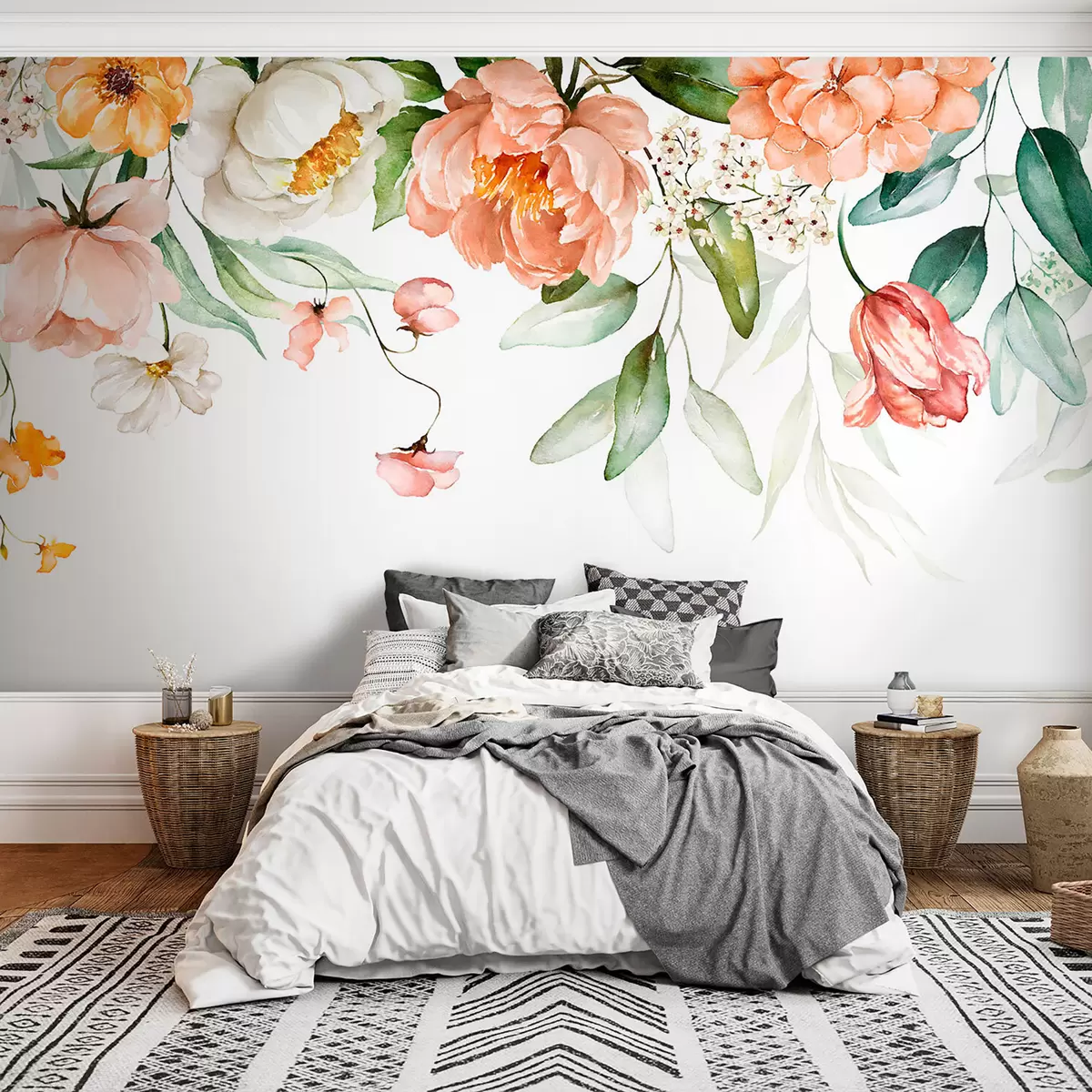 Тапете за зид Боукует Бордер - Зелени листови и ружичасто ружичасто цвеће на белој позадини бр. u94427