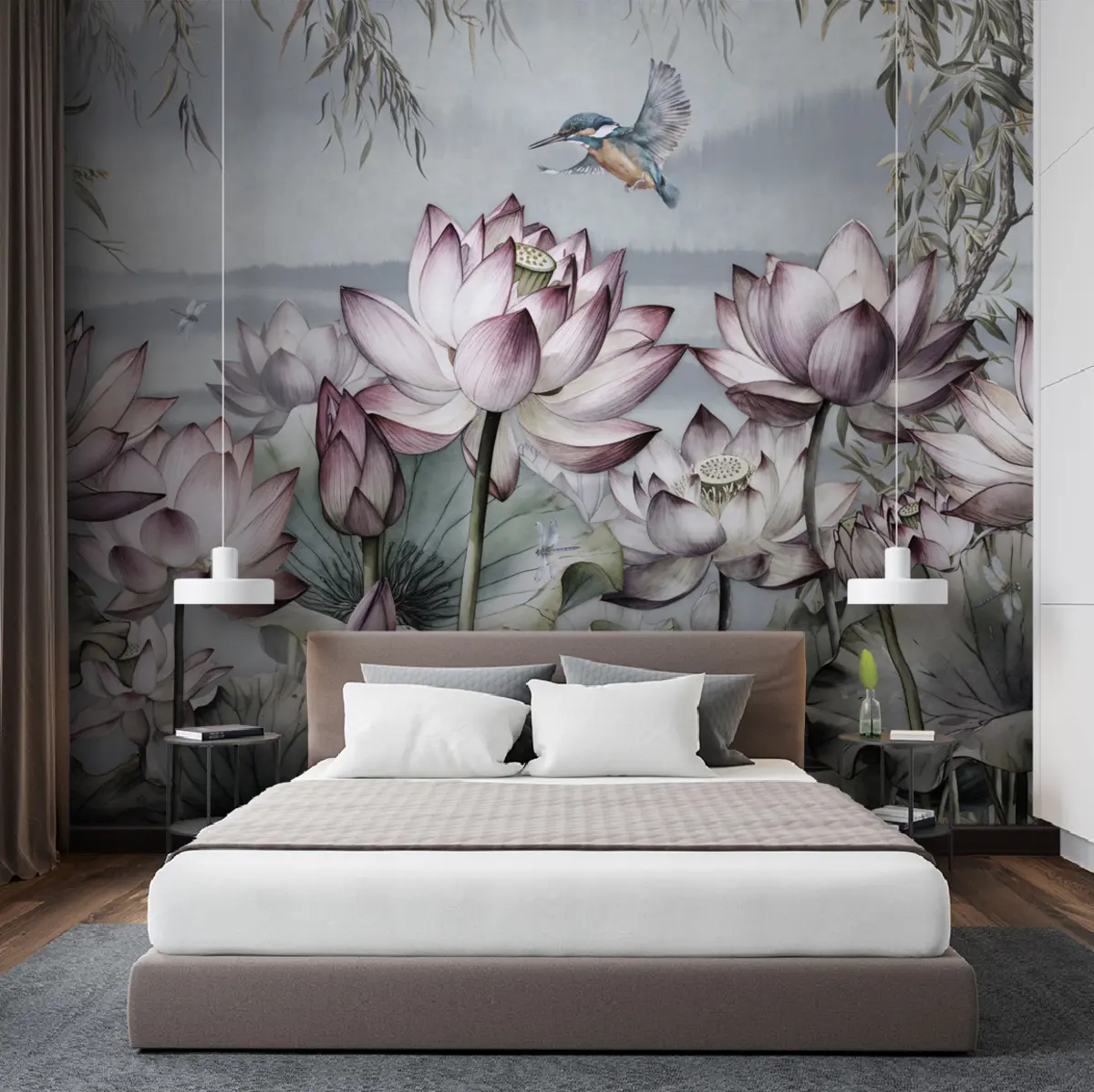 Тапете за зид Пејзажни цвет лотоса са кингфишером бр. u95397