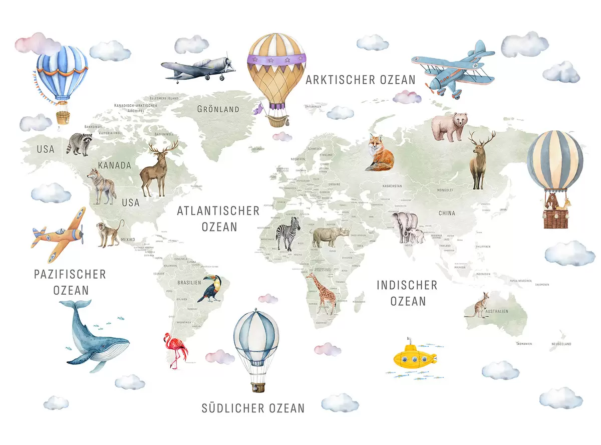 Тапете за зид Дечја мапа у акварел стилу са животињама и балонима на врући ваздух. Немачки језик. Зелена боја. бр. c00001de