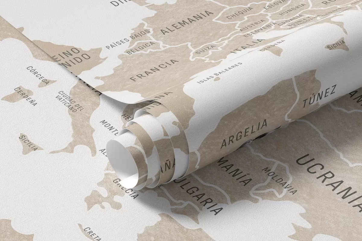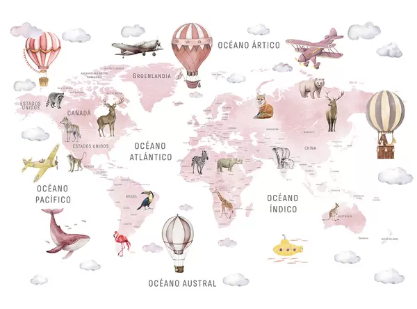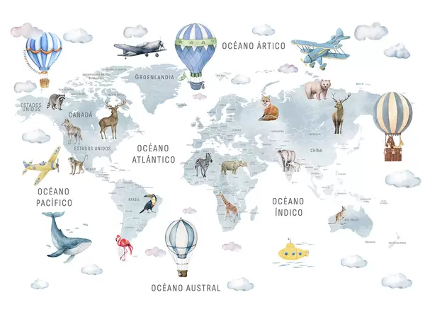 Тапете за зид Дечја мапа у акварел стилу са животињама и балонима на врући ваздух. Шпански језик. Беж боја. бр. c00001esv2