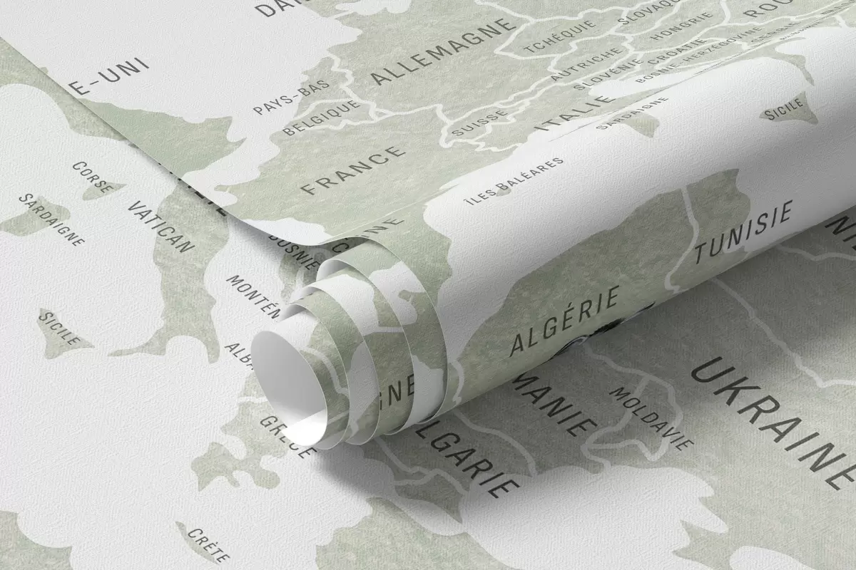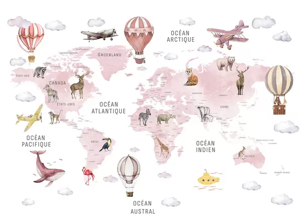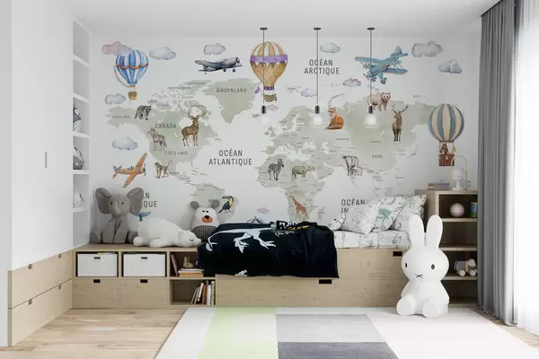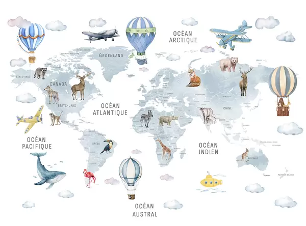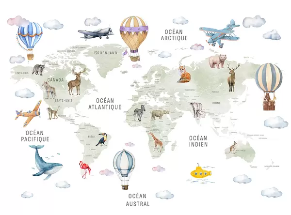Тапете за зид Дечја мапа у акварел стилу са животињама и балонима на врући ваздух. Француски језик. Зелена боја. бр. c00001fr