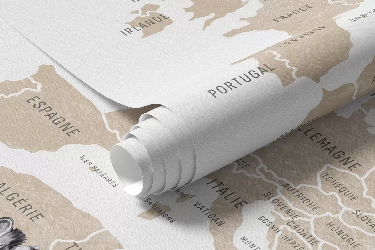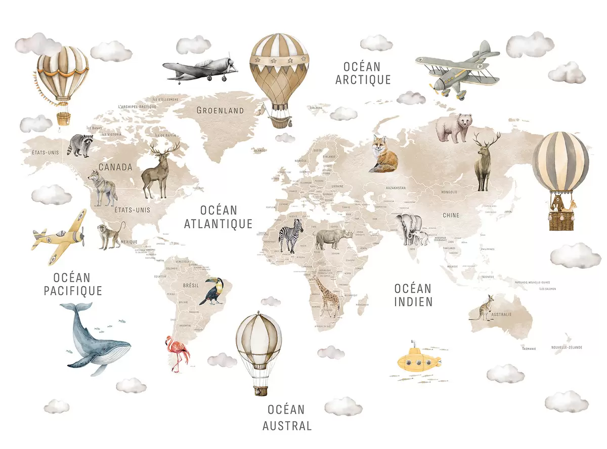 Тапете за зид Дечја мапа у акварел стилу са животињама и балонима на врући ваздух. Француски језик. Беж боја. бр. c00001frv2