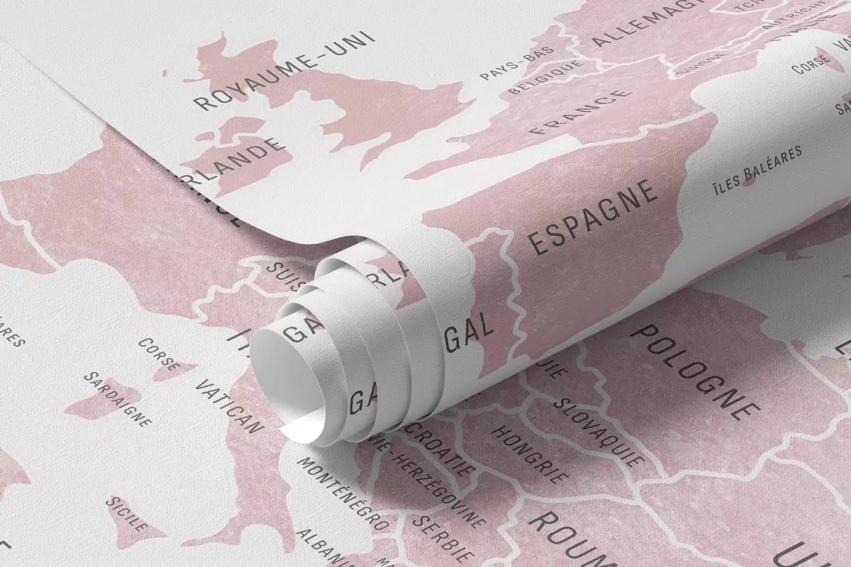 Тапете за зид Дечја мапа у акварел стилу са животињама и балонима на врући ваздух. Француски језик. Ружичаста боја. бр. c00001frv3