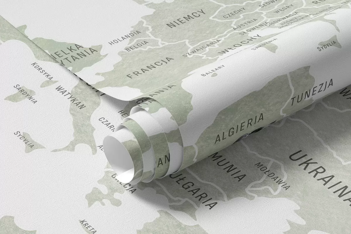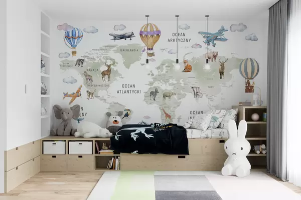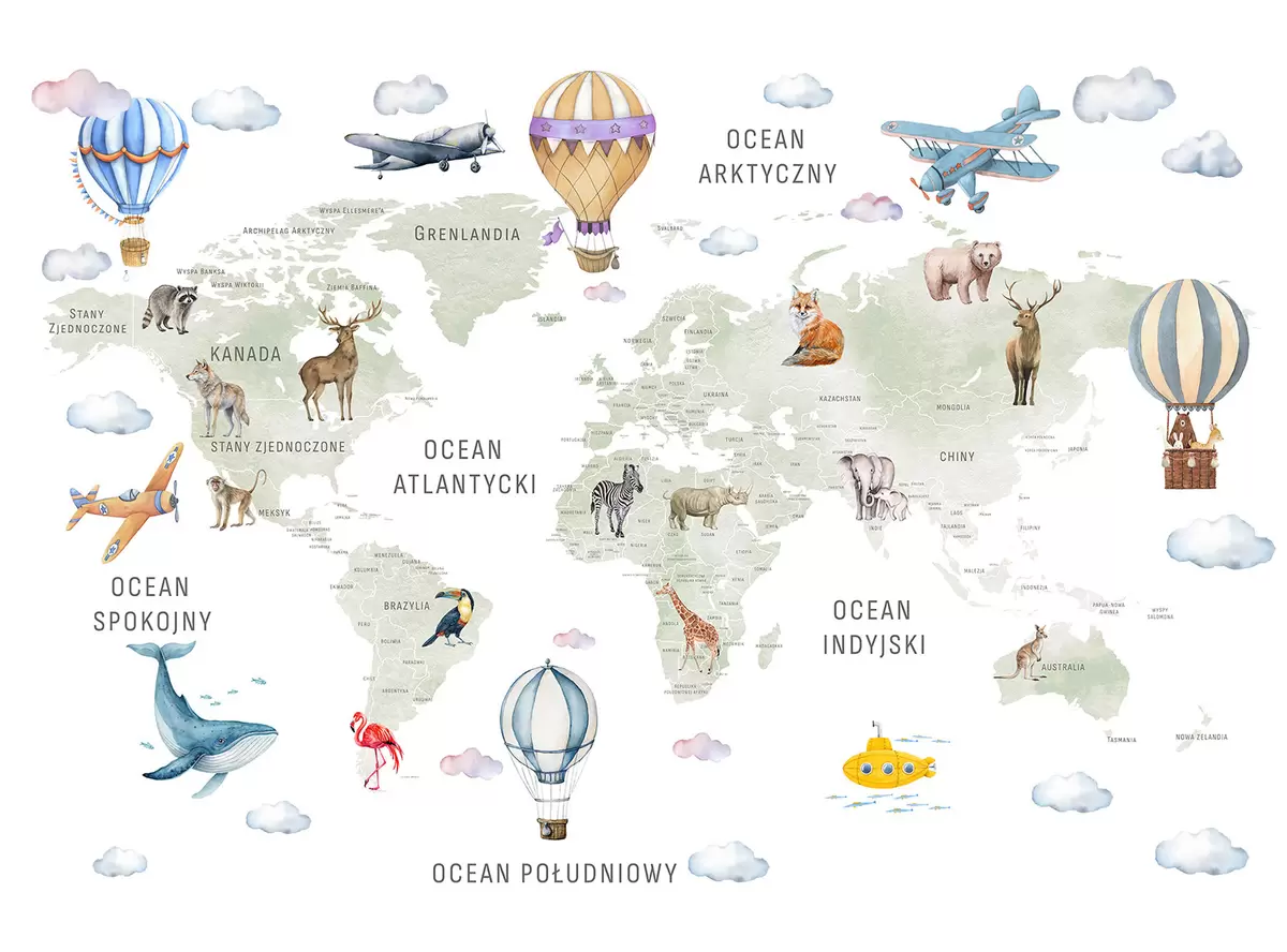 Тапете за зид Дечја мапа у акварел стилу са животињама и балонима на врући ваздух. Пољски језик. Зелена боја. бр. c00001pl