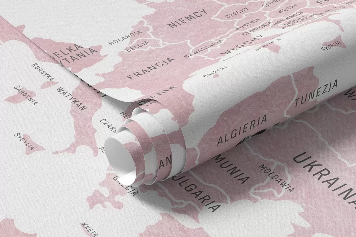 Тапете за зид Дечја мапа у акварел стилу са животињама и балонима на врући ваздух. Пољски језик. Ружичаста боја. бр. c00001plv3