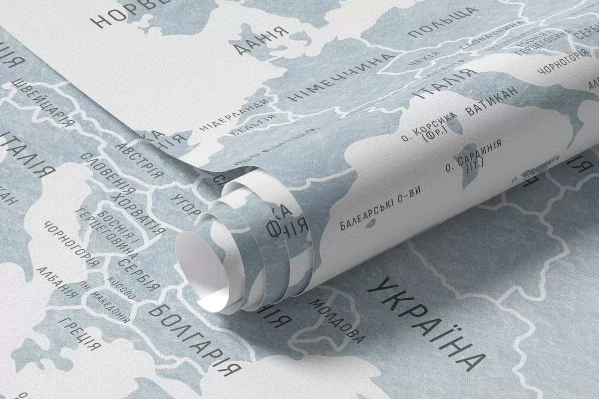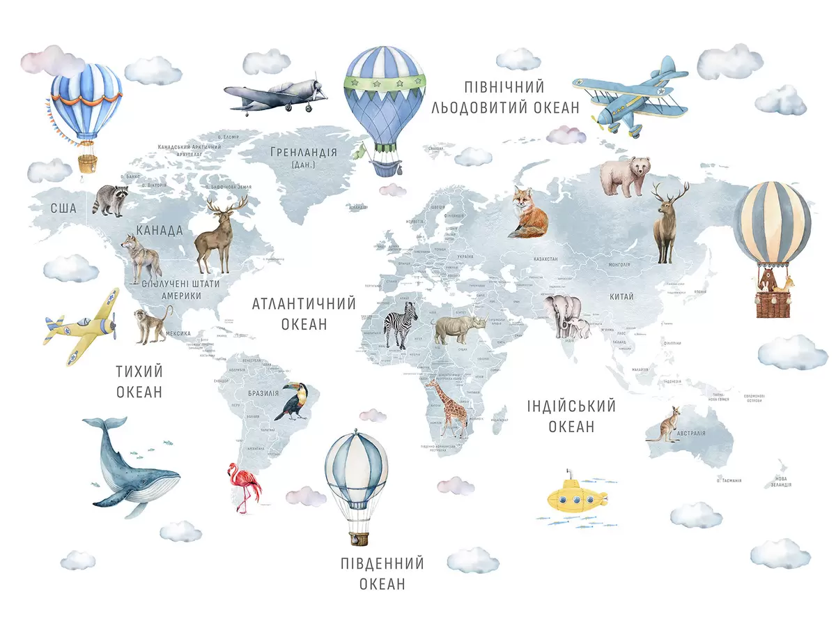 Тапете за зид Дечја мапа у акварел стилу са животињама и балонима на врући ваздух. Украјински језик. Плава боја. бр. c00001ukv1