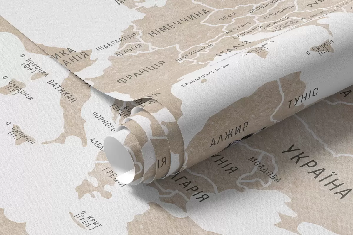Тапете за зид Дечја мапа у акварел стилу са животињама и балонима на врући ваздух. Украјински језик. Беж боја. бр. c00001ukv2