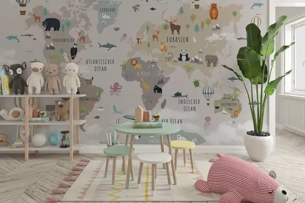 Тапете за зид Дечја мапа света са животињама и балонима на врући ваздух. Немачки језик бр. c00002de