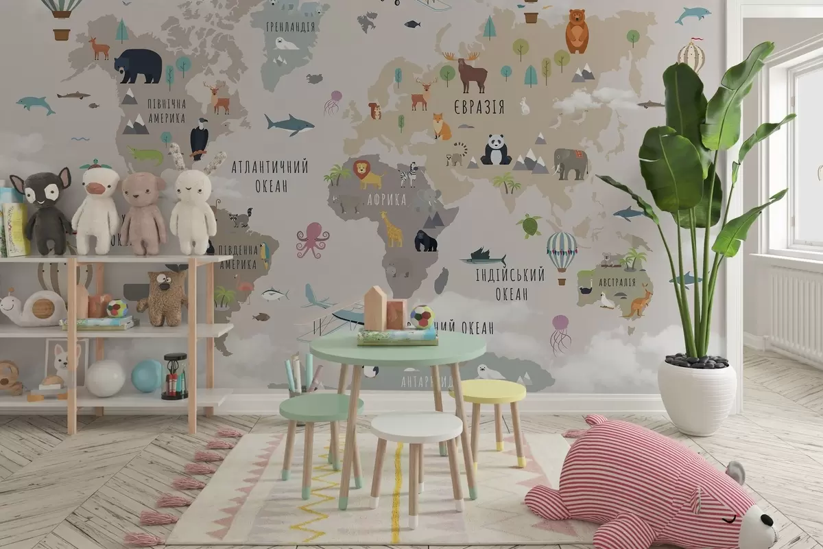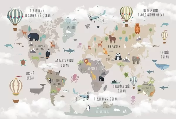 Тапете за зид Дечја мапа света са животињама и балонима на врући ваздух. Украјински језик. бр. c00002uk
