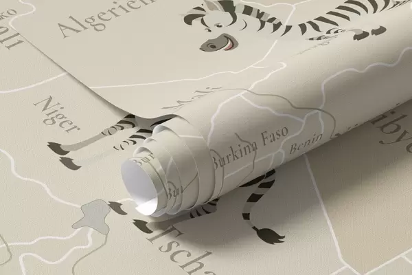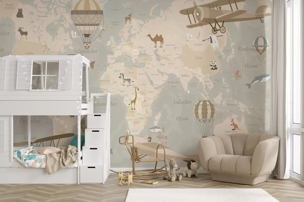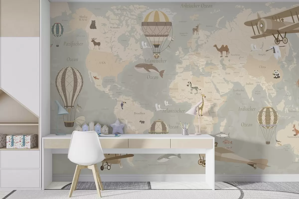 Тапете за зид Дечја мапа света са животињама, авионима и балонима на врући ваздух. Немачки језик. Беж боја бр. c00003de