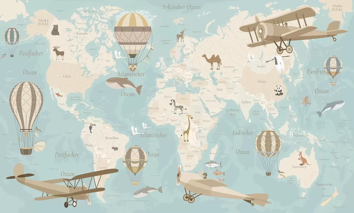 Тапете за зид Дечја мапа света са животињама, авионима и балонима на врући ваздух. Немачки језик. Плава боја. бр. c00003dev1