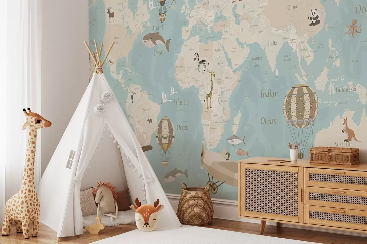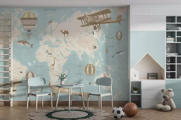 Тапете за зид Дечја мапа света са животињама, авионима и балонима на врући ваздух. Енглески језик. Плава боја. бр. c00003env1
