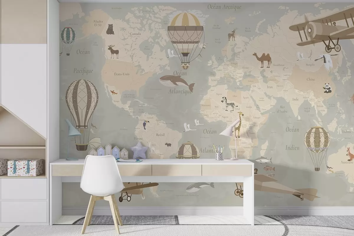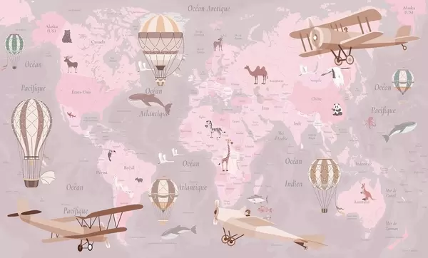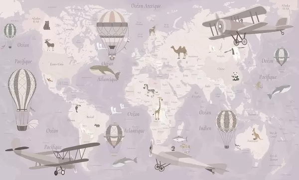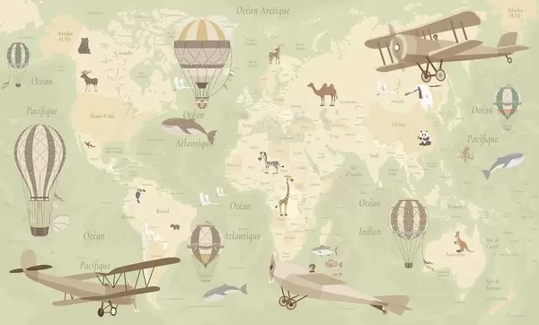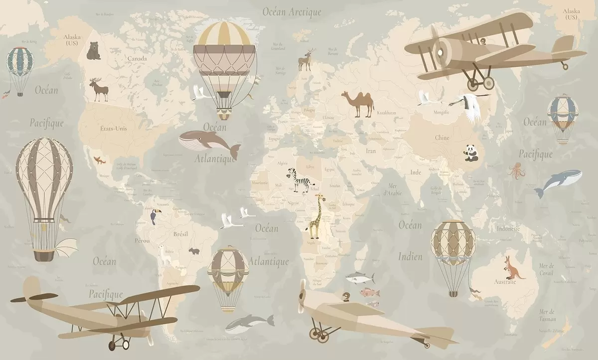 Тапете за зид Дечја мапа света са животињама, авионима и балонима на врући ваздух. Француски језик. Беж боја. бр. c00003fr