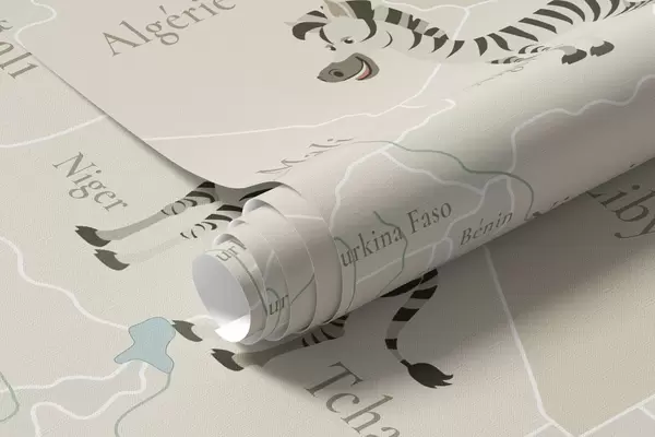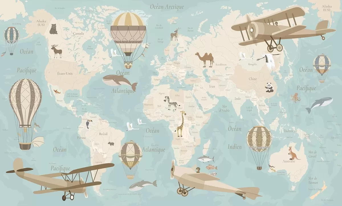 Тапете за зид Дечја мапа света са животињама, авионима и балонима на врући ваздух. Француски језик. Плава боја. бр. c00003frv1