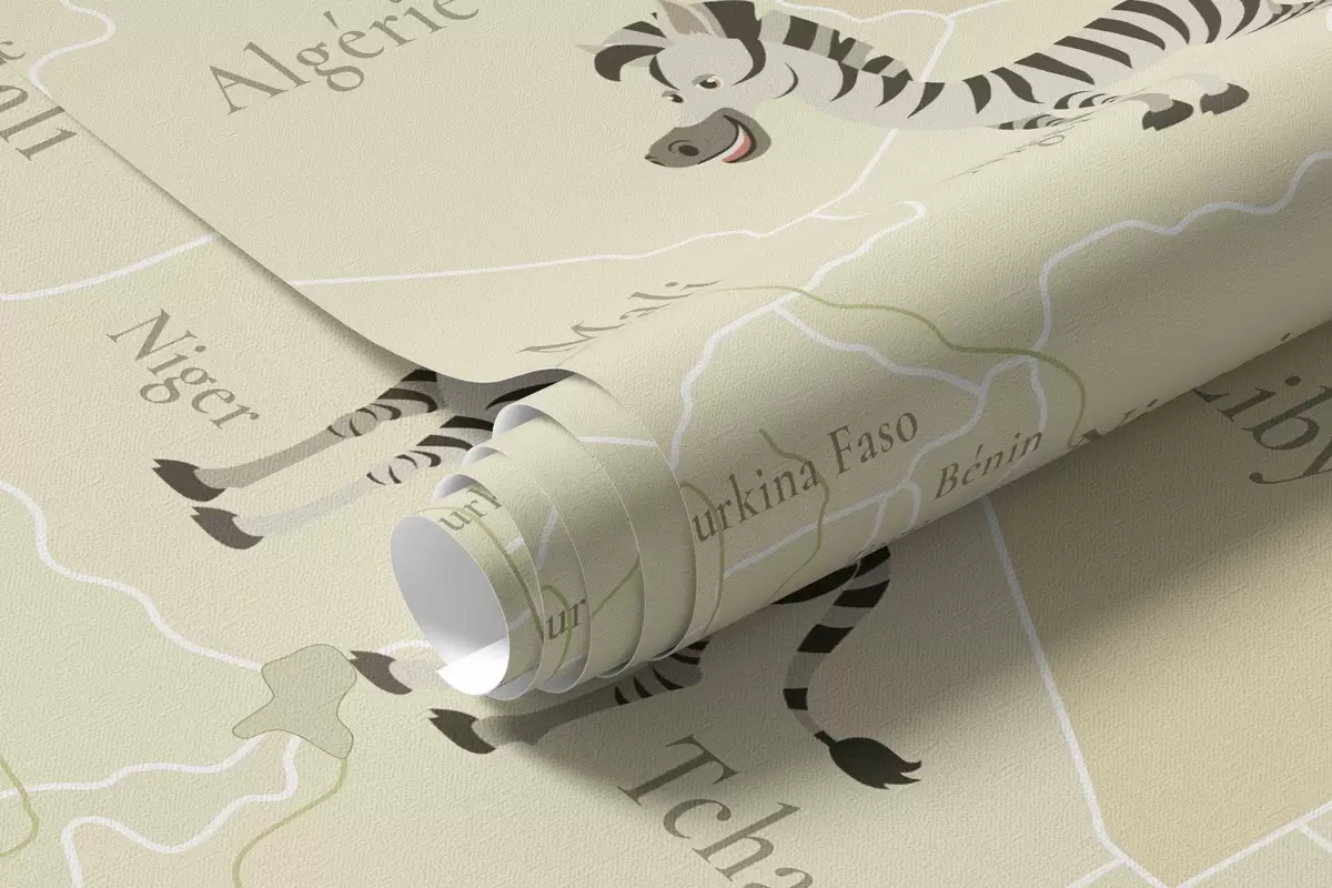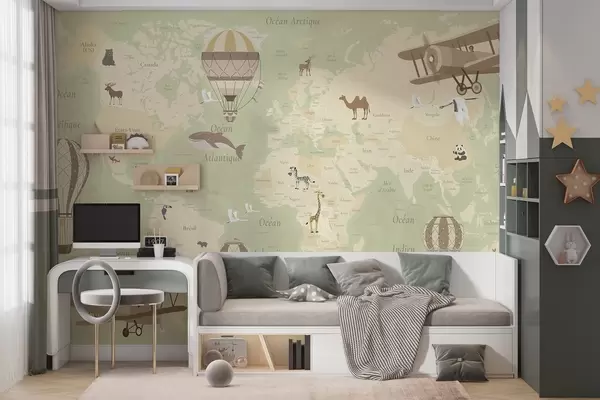 Тапете за зид Дечја мапа света са животињама, авионима и балонима на врући ваздух. Француски језик. Зелена боја. бр. c00003frv2
