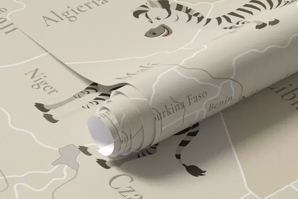 Тапете за зид Дечја мапа света са животињама, авионима и балонима на врући ваздух. Пољски језик. Беж боја бр. c00003pl