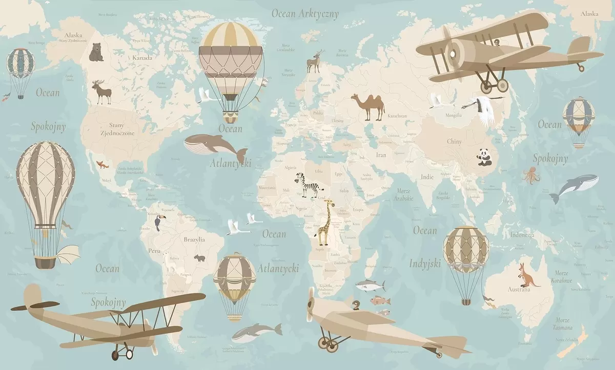 Тапете за зид Дечја мапа света са животињама, авионима и балонима на врући ваздух. Пољски језик. Плава боја. бр. c00003plv1