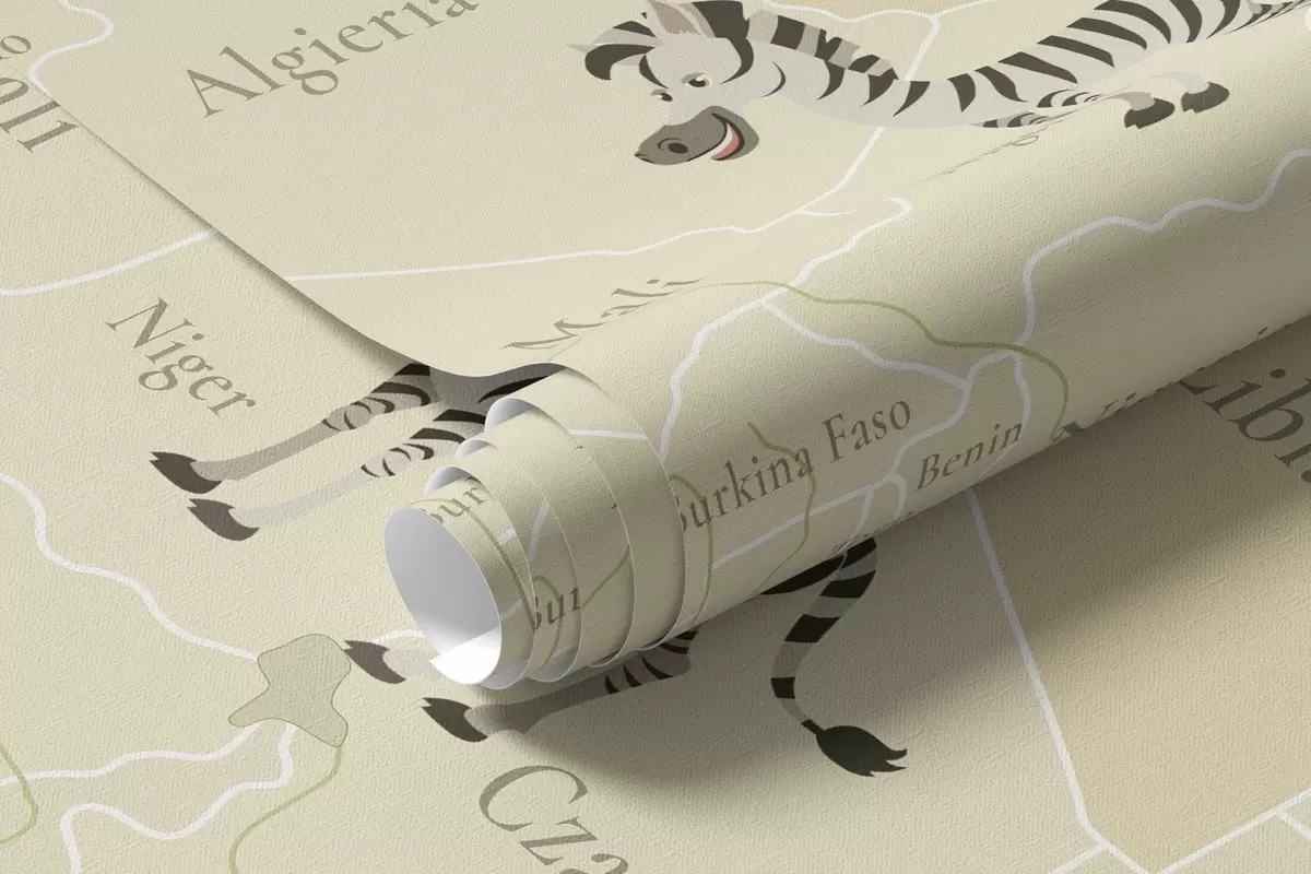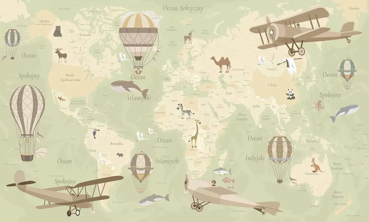 Тапете за зид Дечја мапа света са животињама, авионима и балонима на врући ваздух. Пољски језик. Зелена боја. бр. c00003plv2