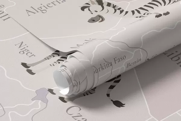 Тапете за зид Дечја мапа света са животињама, авионима и балонима на врући ваздух. Пољски језик. Љубичаста боја. бр. c00003plv4