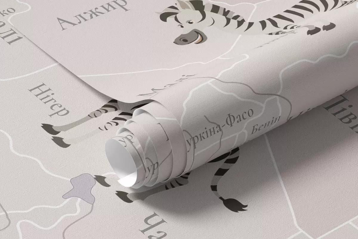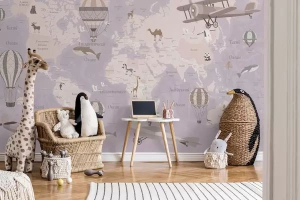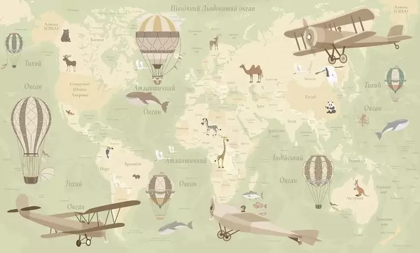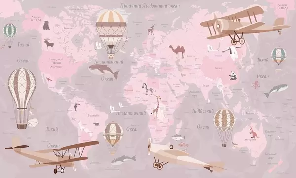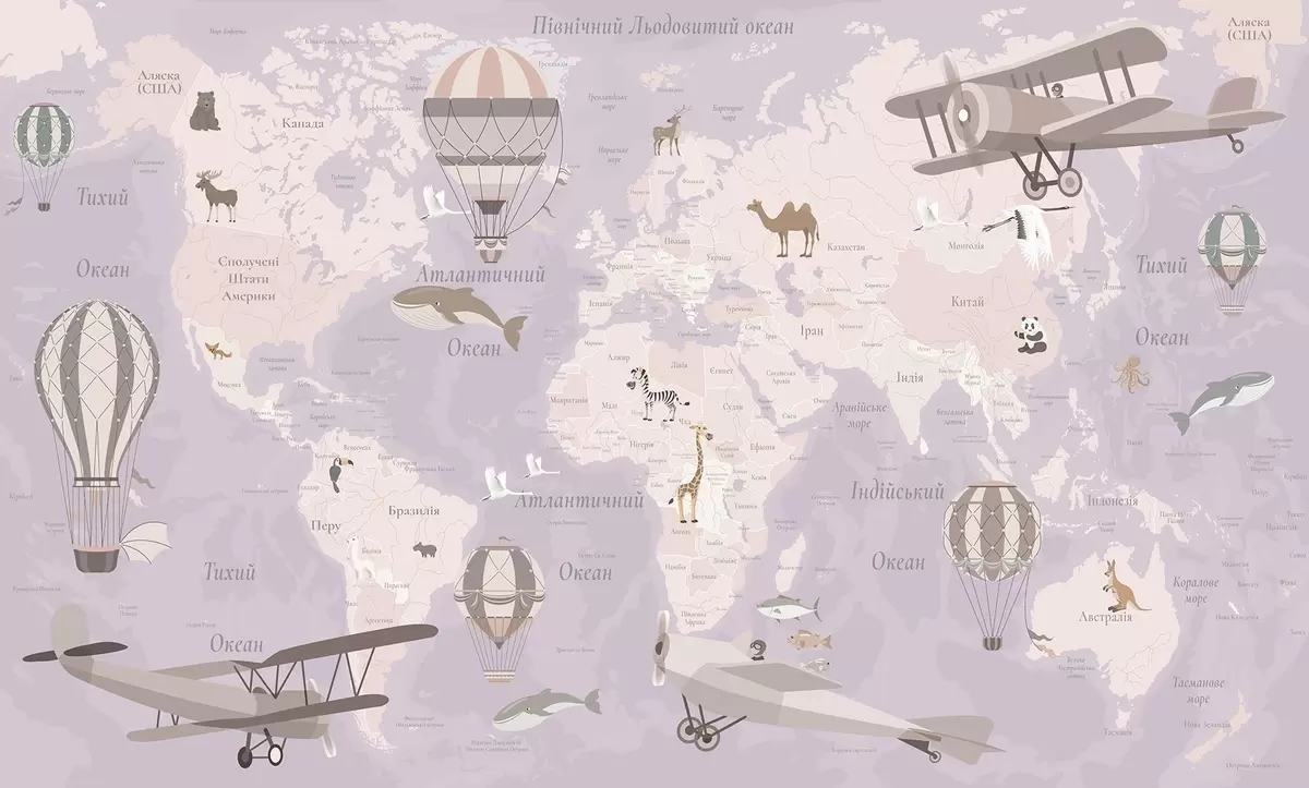 Тапете за зид Дечја мапа света са животињама, авионима и балонима на врући ваздух. Украјински језик. Љубичаста боја. бр. c00003ukv4