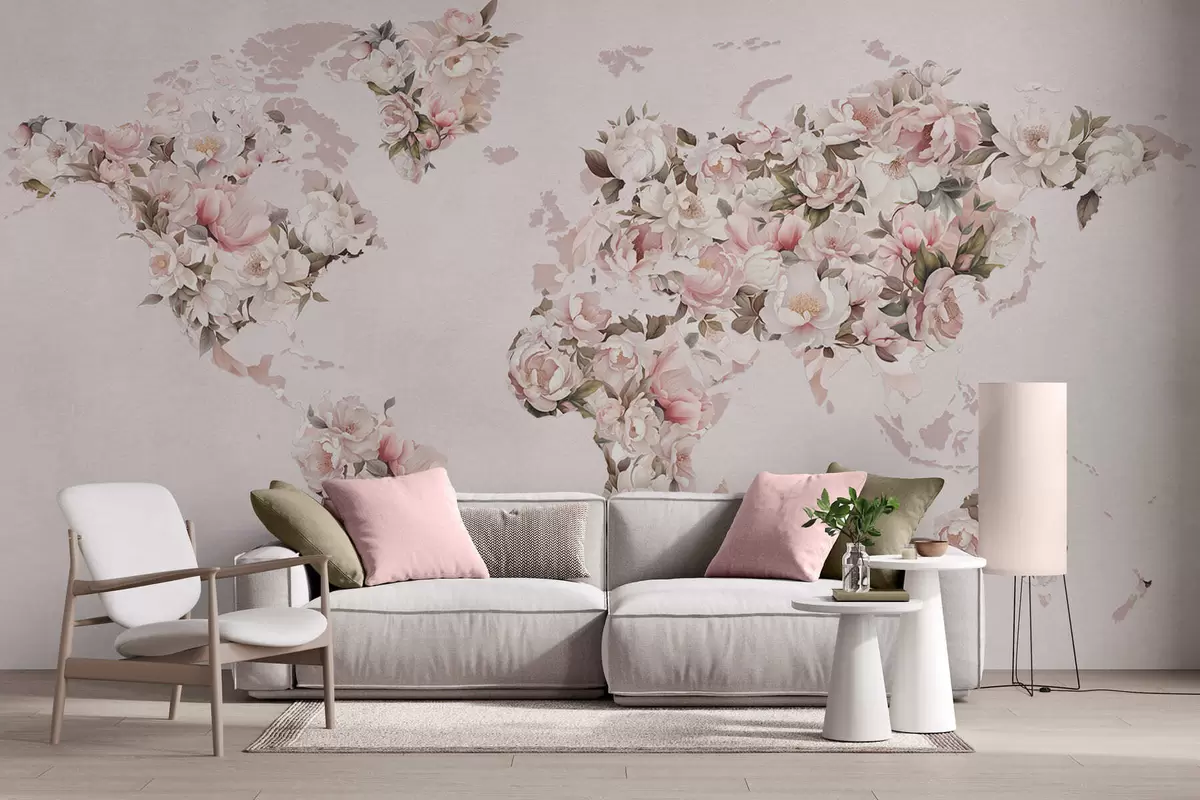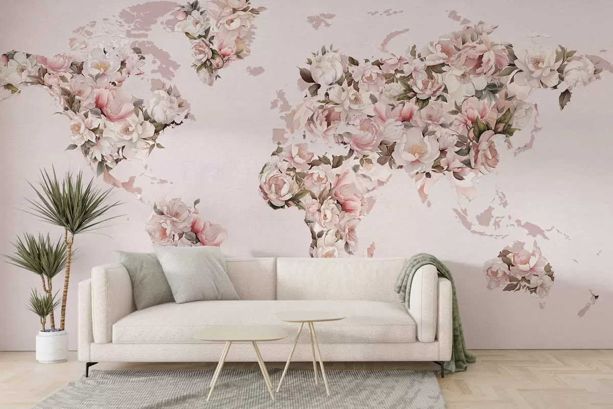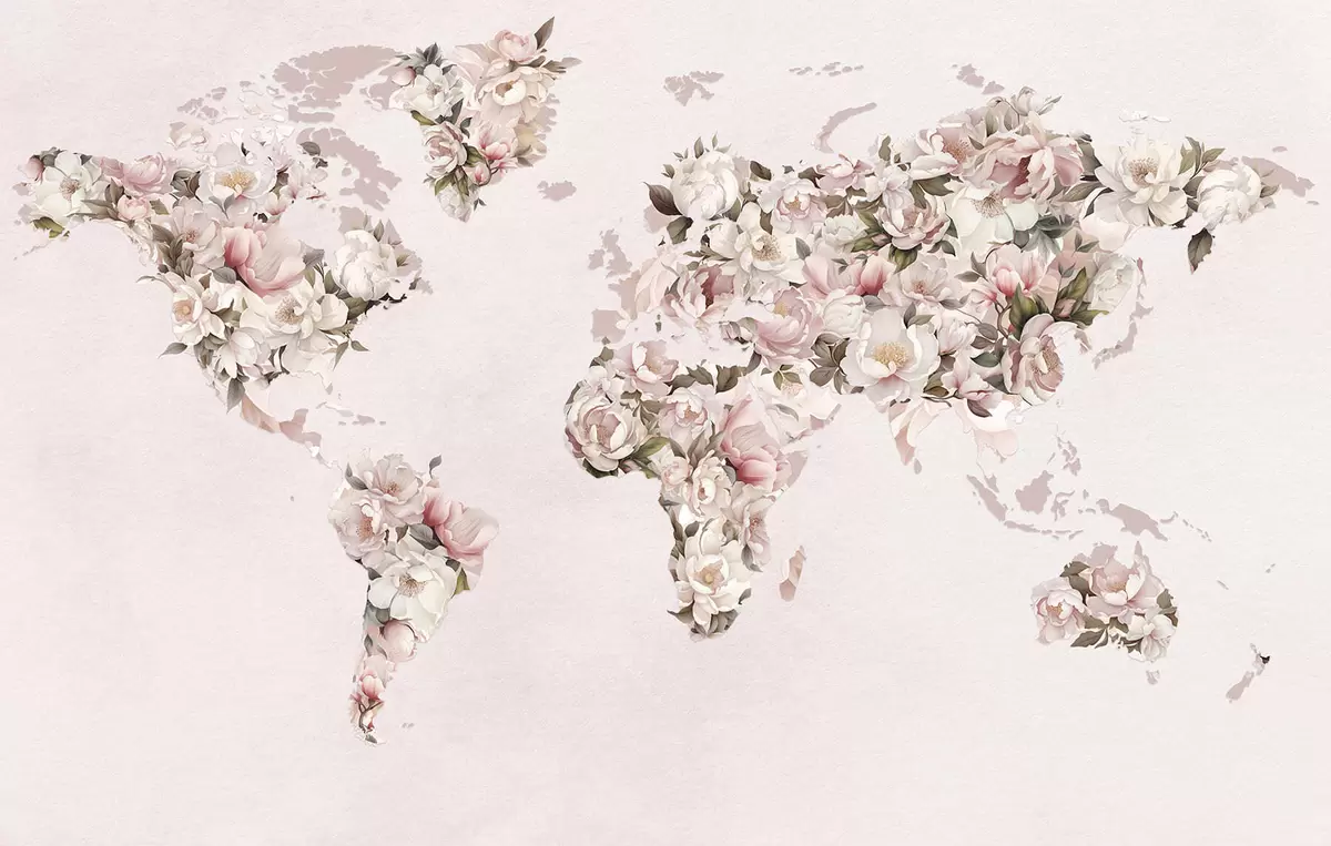 Тапете за зид Ружичаста мапа света направљена од великих белих и ружичастих божура бр. c00005