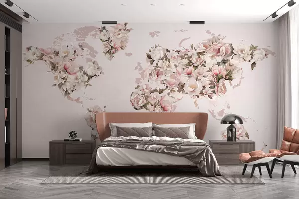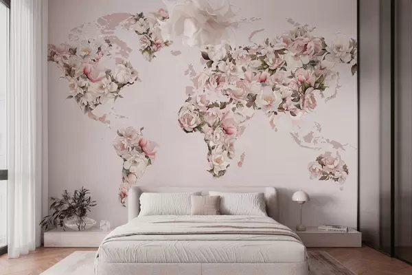 Тапете за зид Ружичаста мапа света направљена од великих белих и ружичастих божура бр. c00005