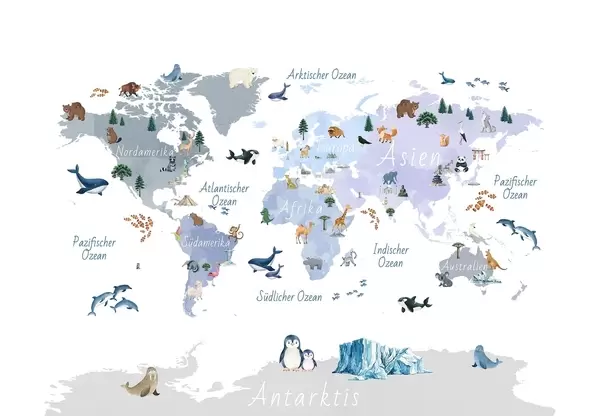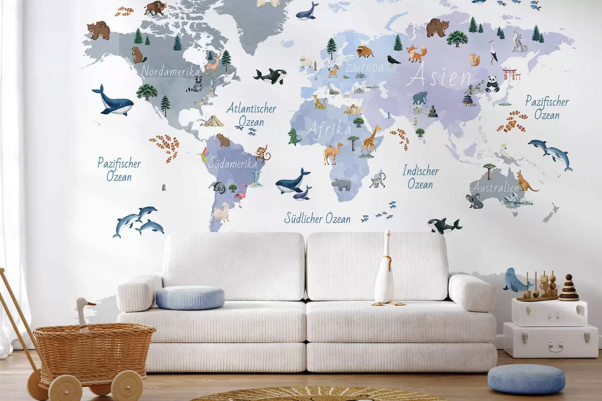 Тапете за зид Плава мапа у акварелу са животињама, биљкама и архитектуром. Ознаке на немачком језику. бр. c00009dev1