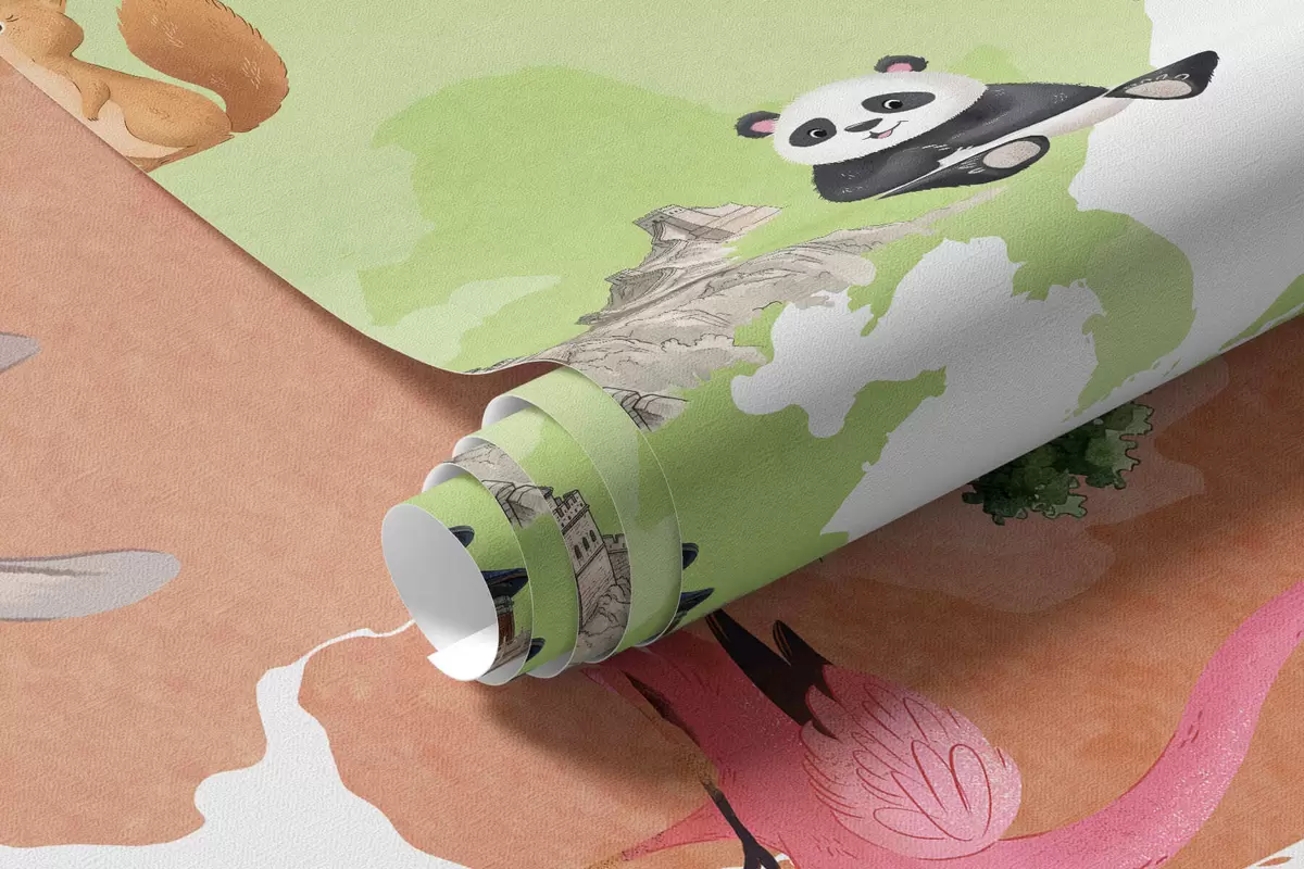 Тапете за зид Мапа у боји у акварел стилу са животињама, биљкама и архитектуром. Ознаке на енглеском језику. бр. c00009en
