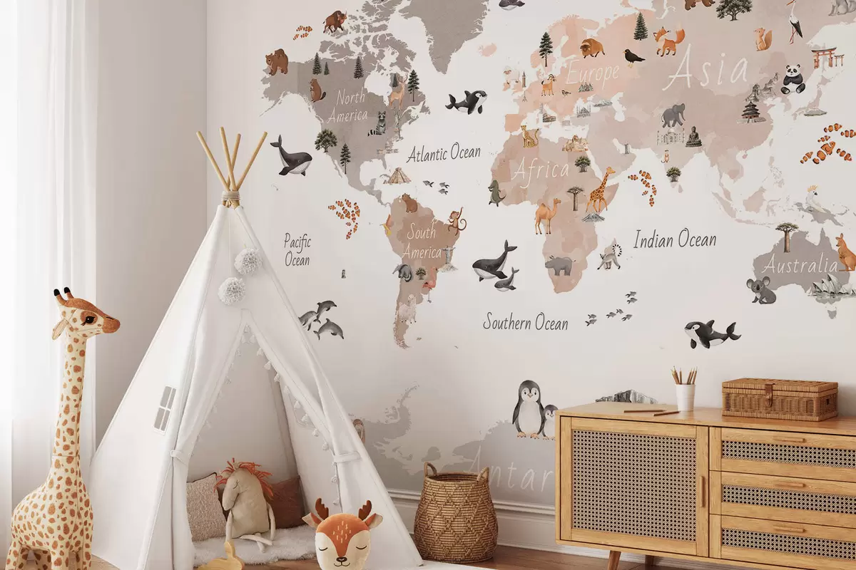 Тапете за зид Беж мапа у акварелу са животињама, биљкама и архитектуром. Ознаке на енглеском језику. бр. c00009env3