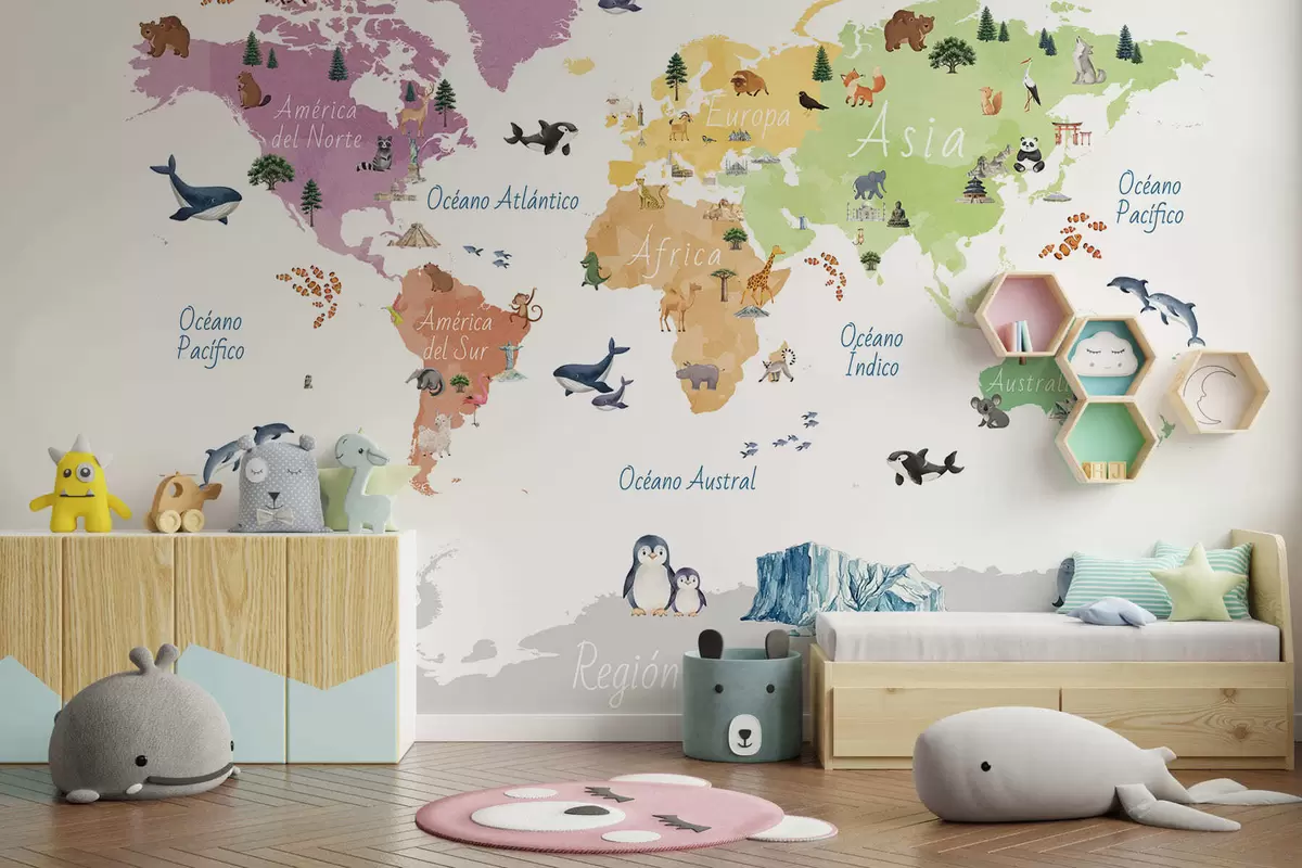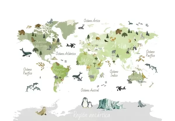 Тапете за зид Мапа у боји у акварел стилу са животињама, биљкама и архитектуром. Ознаке на шпанском језику. бр. c00009es