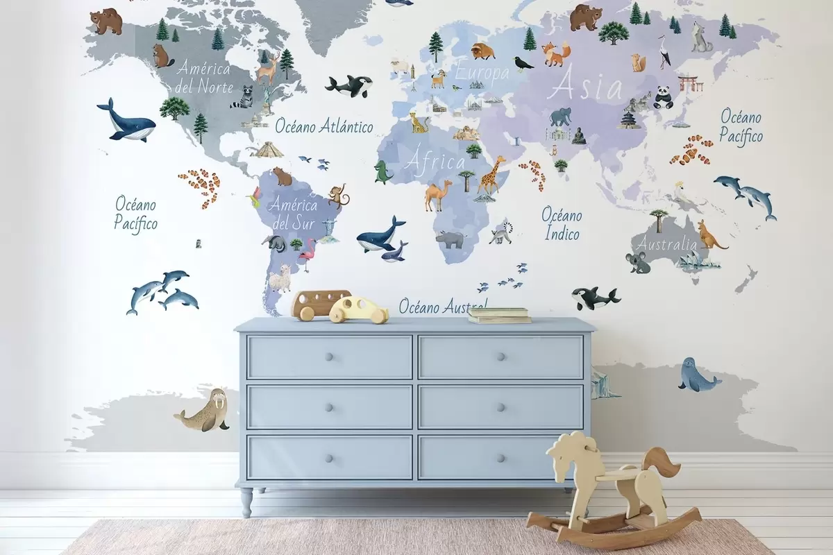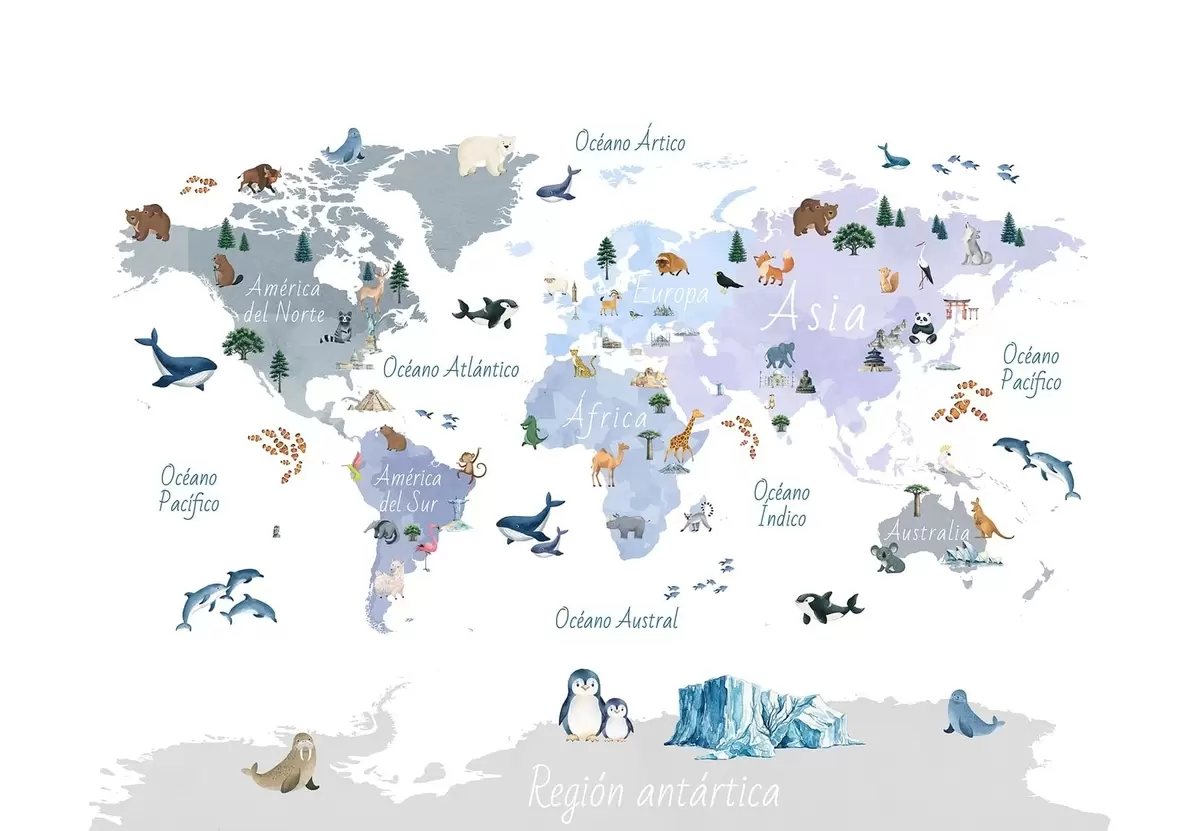 Тапете за зид Плава мапа у акварелу са животињама, биљкама и архитектуром. Ознаке на шпанском. бр. c00009esv1