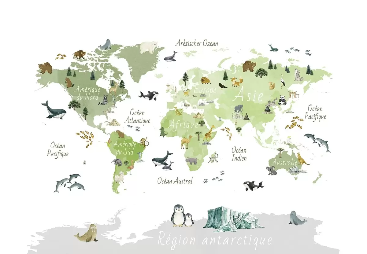 Тапете за зид Зелена мапа у акварелу са животињама, биљкама и архитектуром. Ознаке на француском језику. бр. c00009frv2