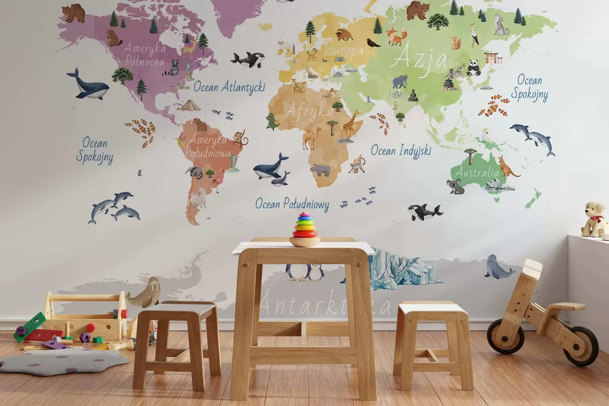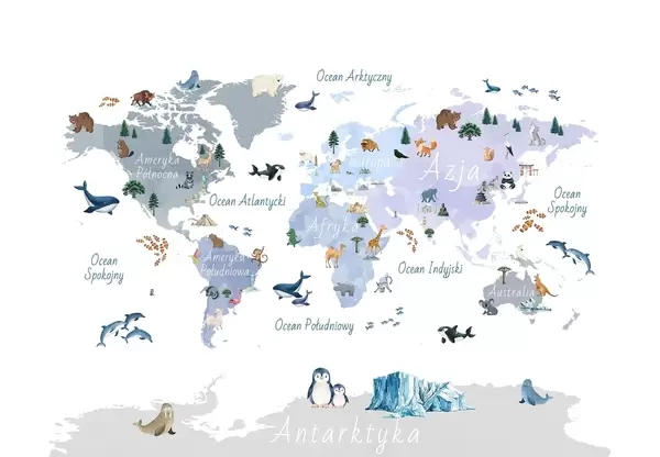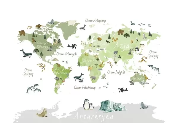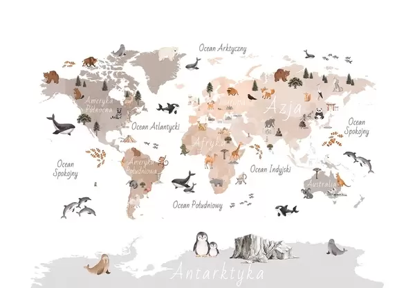 Тапете за зид Мапа у боји у акварелу са животињама, биљкама и архитектуром. Ознаке на пољском језику. бр. c00009pl