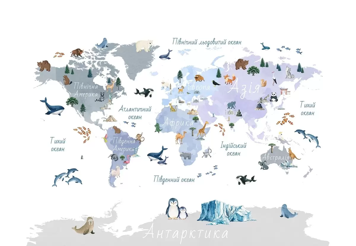 Тапете за зид Плава мапа у акварелу са животињама, биљкама и архитектуром. Ознаке на украјинском језику. бр. c00009ukv1