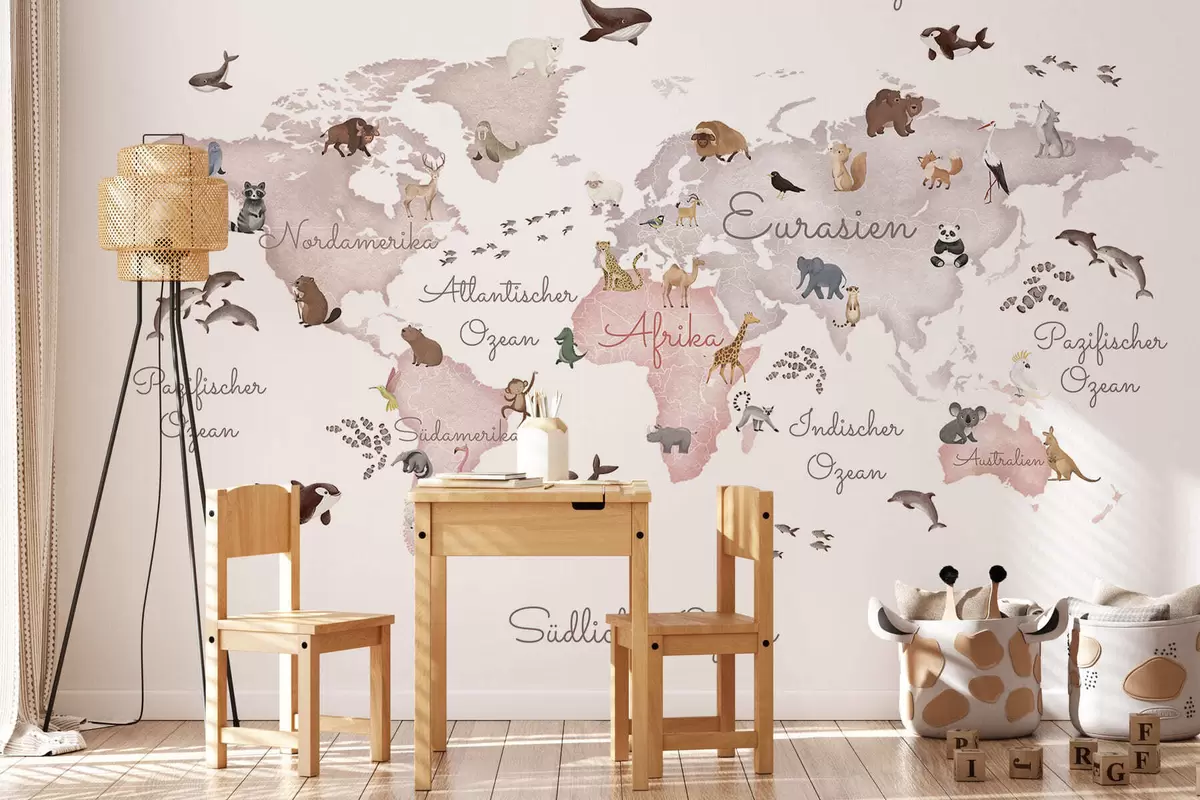 Тапете за зид Беж мапа у акварелу са животињама. Ознаке на немачком језику. бр. c00012dev3