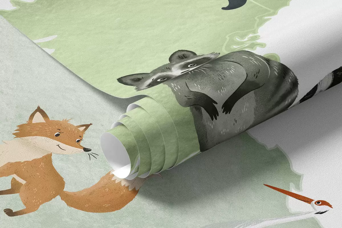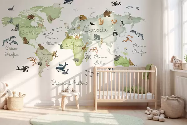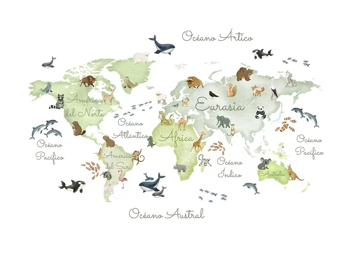 Тапете за зид Зелена мапа у акварелу са животињама. Ознаке на шпанском. бр. c00012esv2
