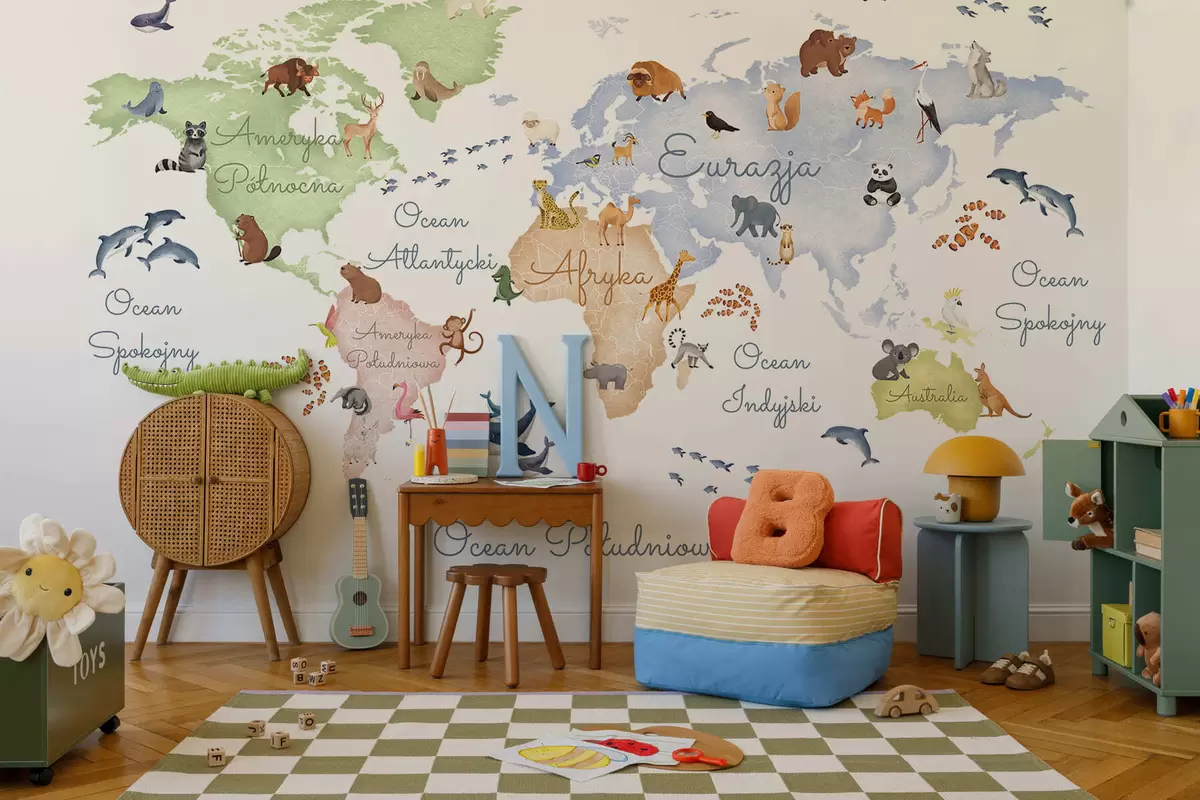 Тапете за зид Мапа у боји у акварелу са животињама. Ознаке на пољском језику. бр. c00012pl