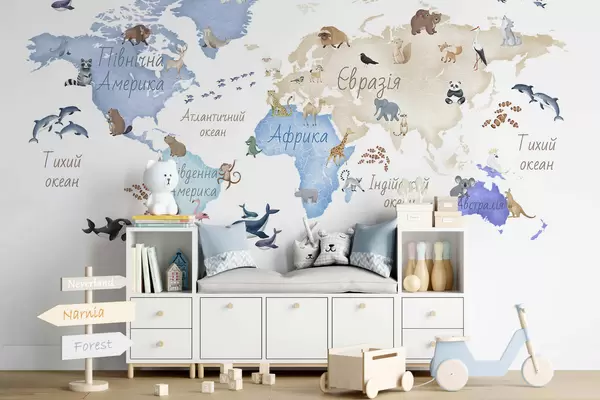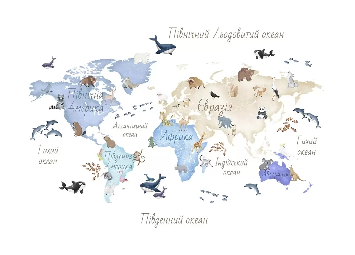 Тапете за зид Плава мапа у акварелу са животињама. Ознаке на украјинском језику. бр. c00012ukv1