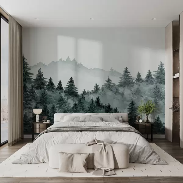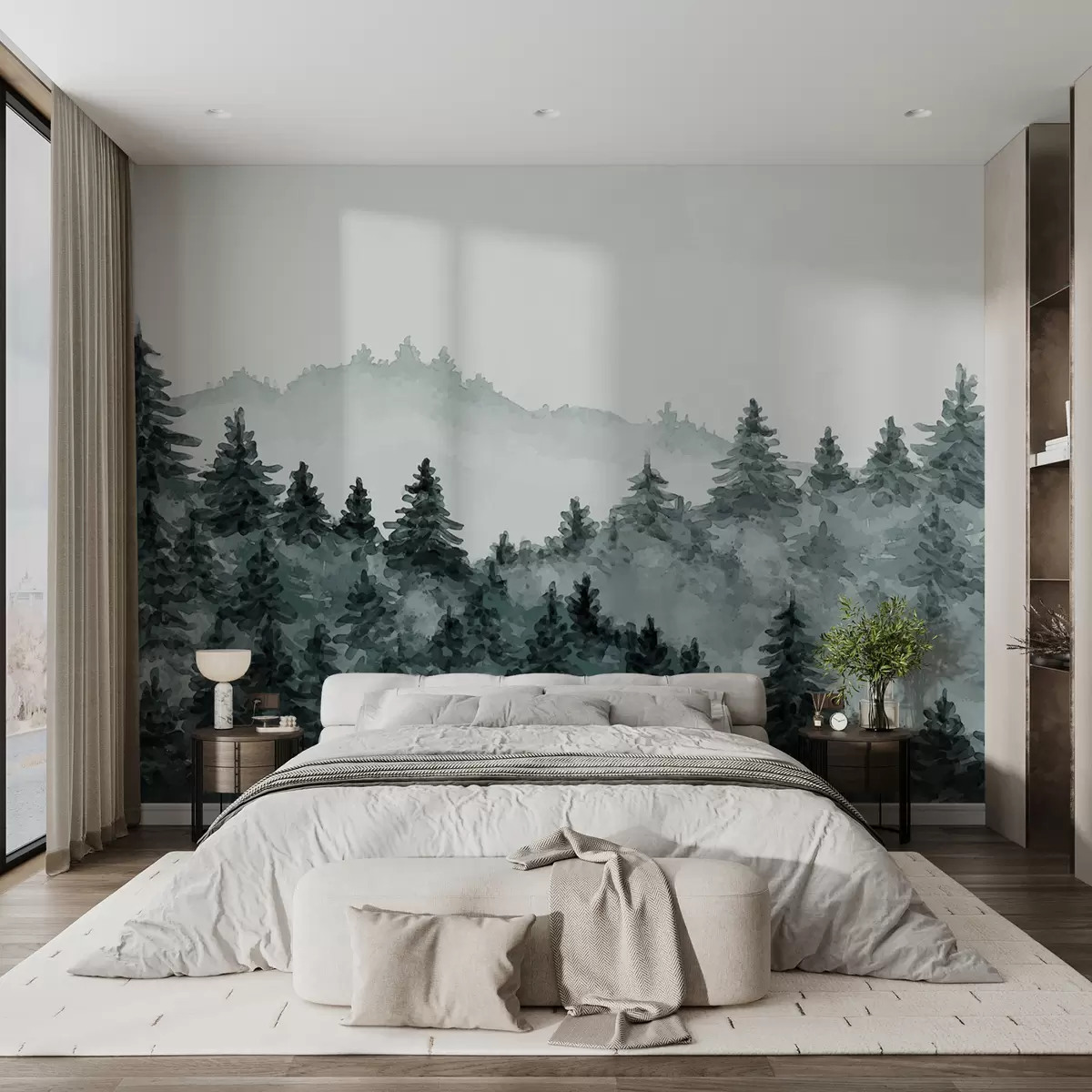 Тапете за зид Акварел шумски пејзаж, магла, зелена боја, борови бр. u98994