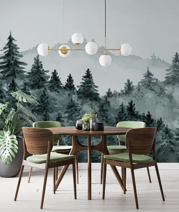 Тапете за зид Акварел шумски пејзаж, магла, зелена боја, борови бр. u98994