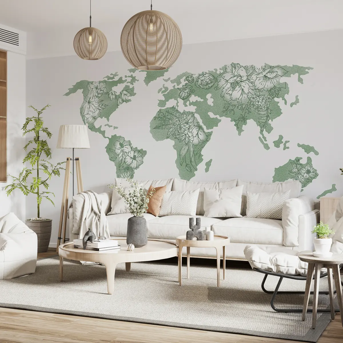 Тапете за зид Цветна карта света, украсни, божури, љиљан, зелена боја, цртање линија бр. u99734v3