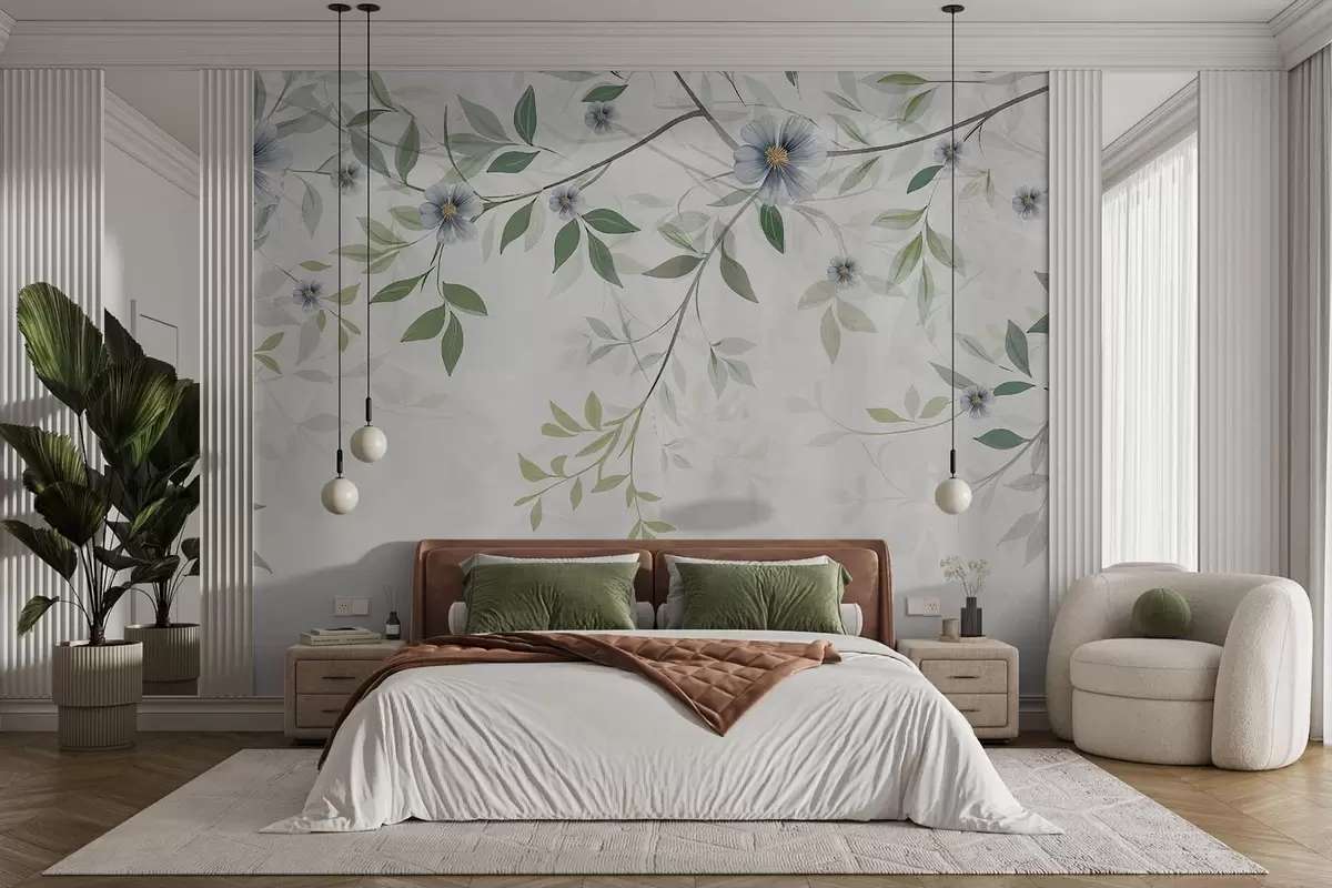 Тапете за зид Гране са зеленим листовима и плавим цветовима бр. w00316
