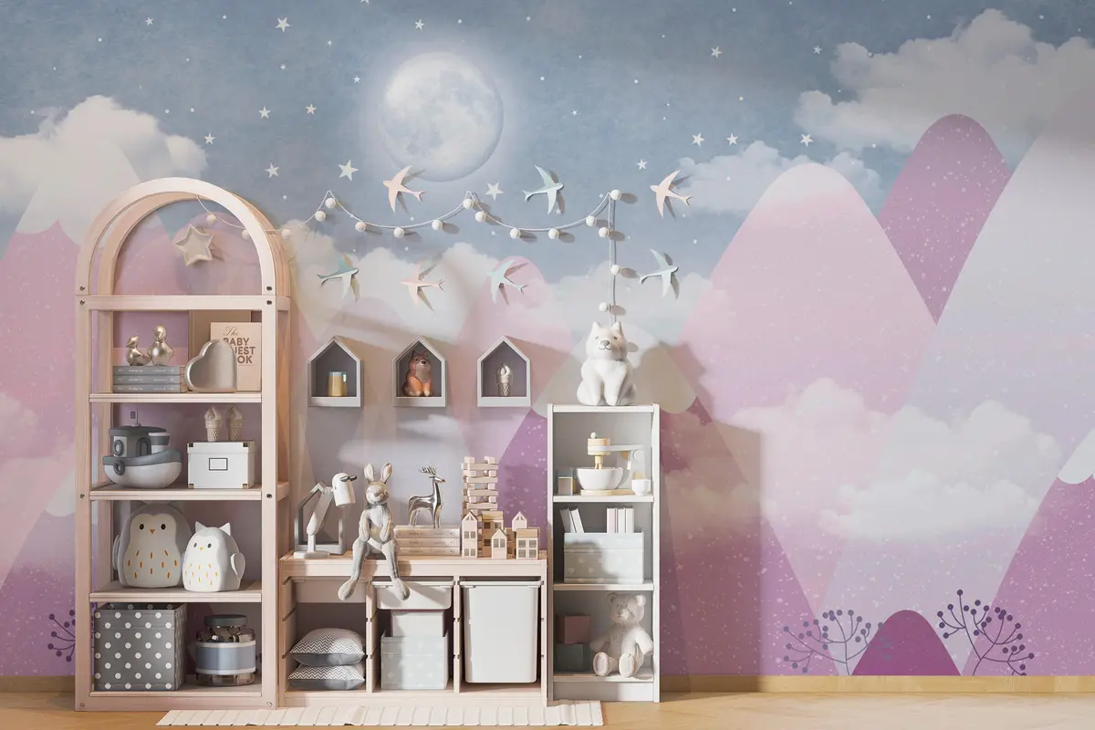 Тапете за зид Месец над снежним планинама, дечија илустрација плаве боје бр. w00374v1