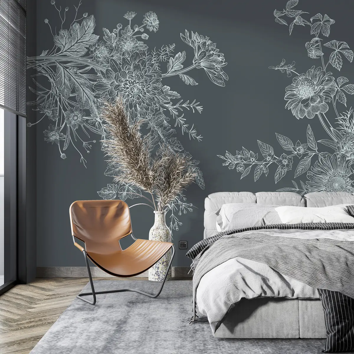 Тапете за зид Цветни орнамент, минимализам, уметност линија, бохо стил, рустикални, божур, тратинчица, тамно плава позадина бр. w00381v1