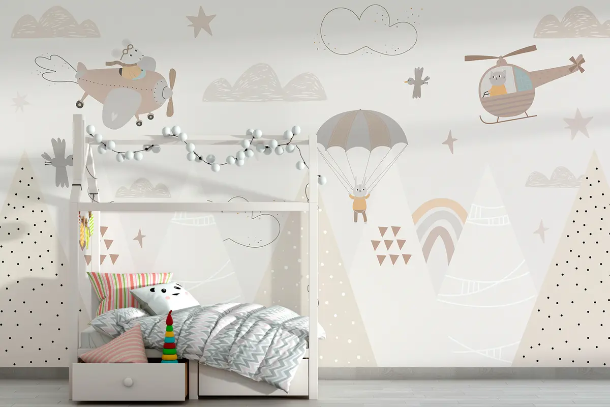 Тапете за зид Беж планине са хеликоптером, авионом и животињама бр. w00414