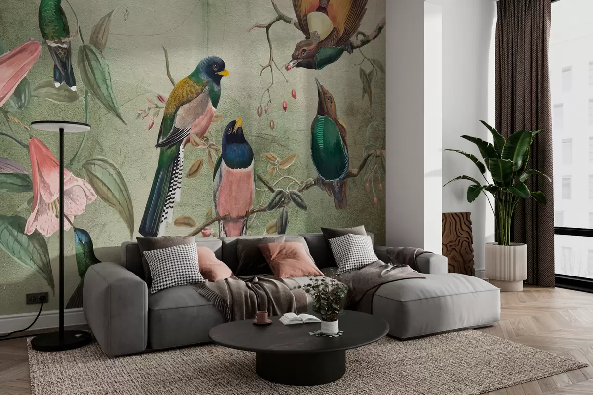 Тапете за зид Група шарених птица седела је на гранама у текстурираној позадини бр. w00543