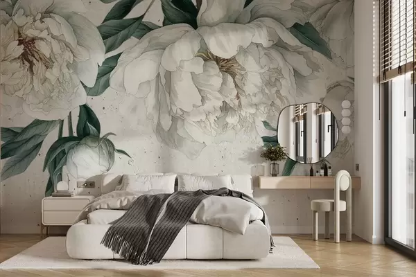 Тапете за зид Бели велики божури са зеленим листовима на светлој текстурној позадини бр. w00837
