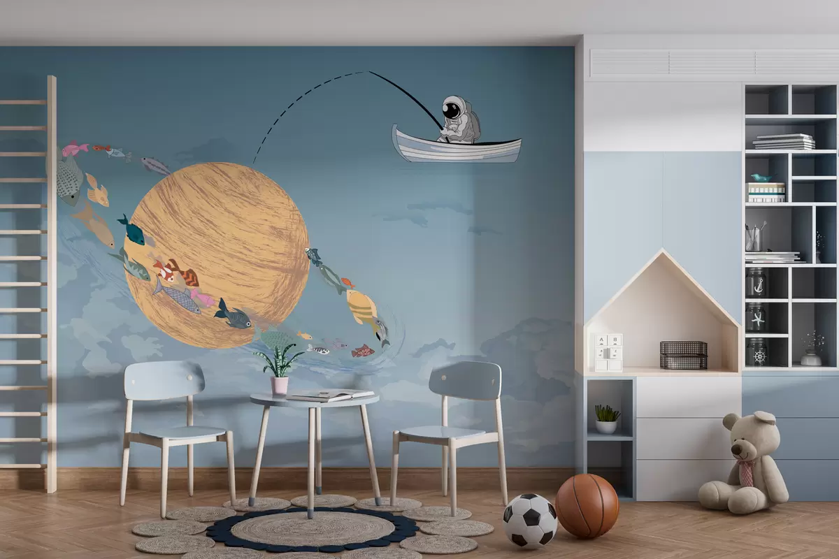 Тапете за зид Астронаут месец и риба у плавом бр. w00869v1